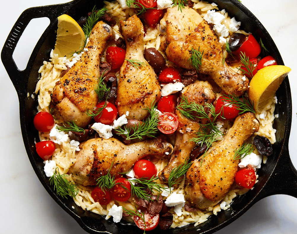 Drumsticks are an often overlooked, cost effective, but fun-to-eat meat and always seem to stay tender and juicy. To add in Greek flavours, the dish blends lemon-y orzo, cherry tomatoes, Kalmata olives and dill!